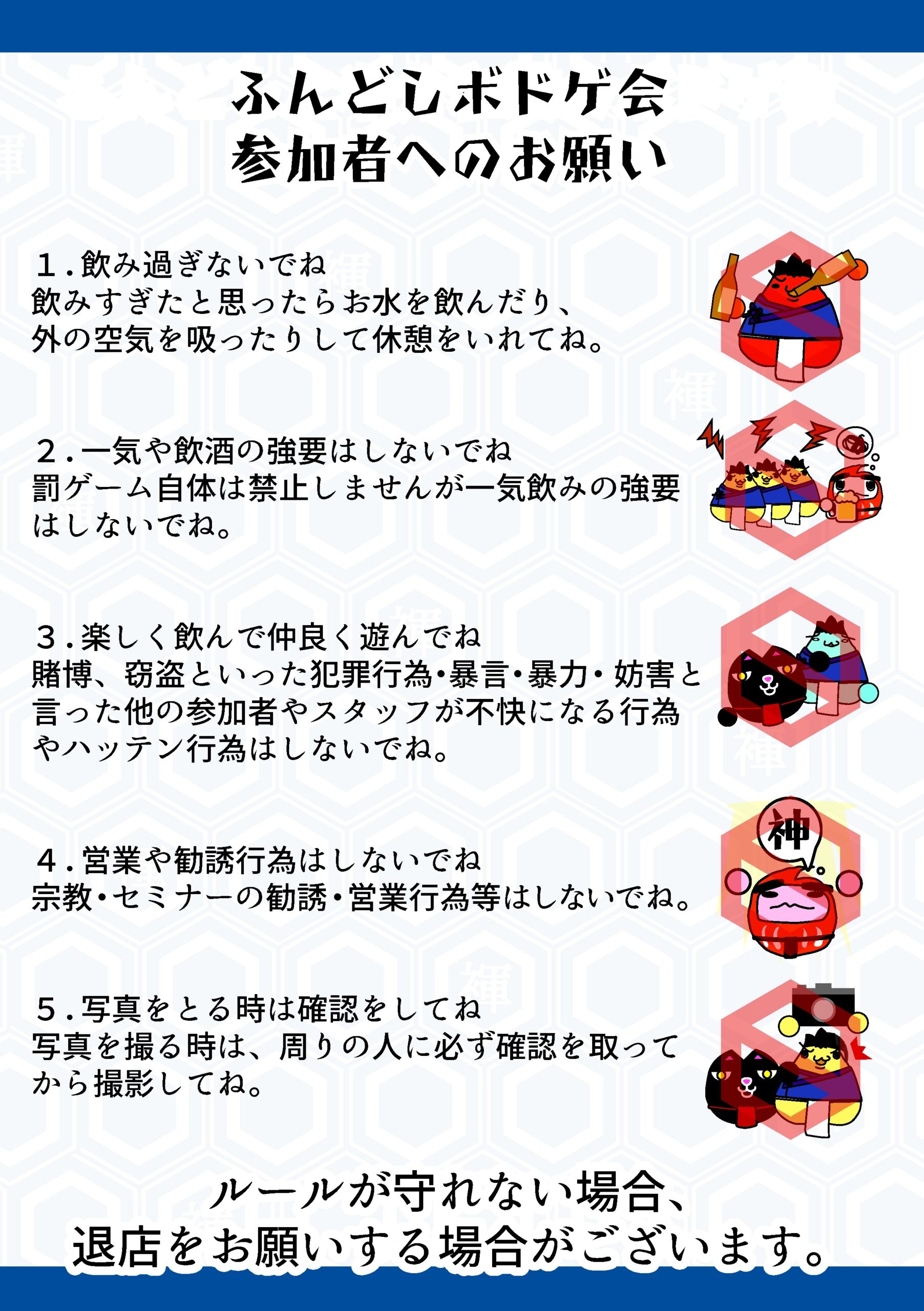 3. マナー重視: 一気飲みの強要、ナンパ(ハッテン)行為、勧誘、写真の無断撮影は厳禁です。