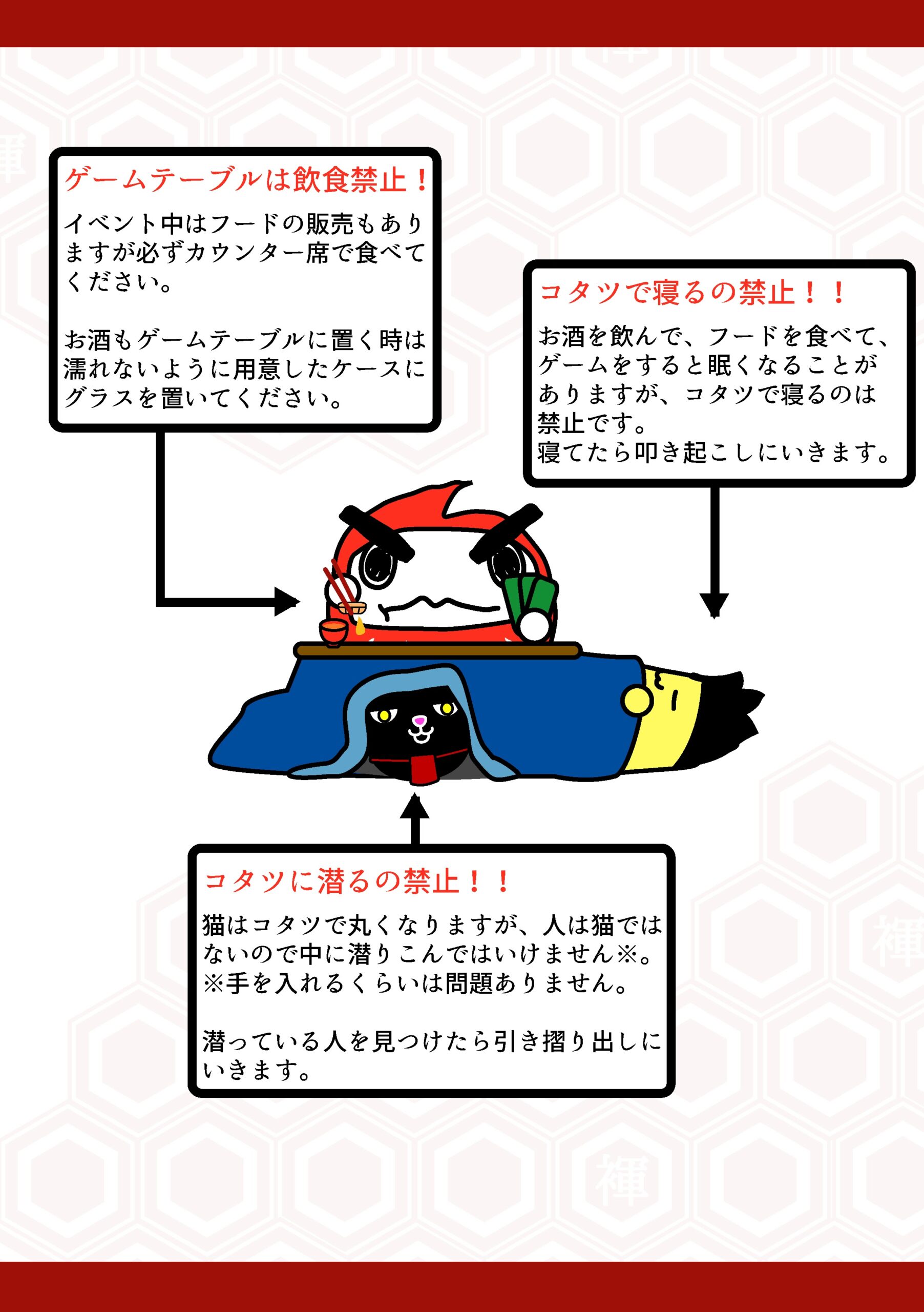 2. コタツの掟: 寝るの禁止!潜るのも禁止!😾(手を入れるのはOK)見つけたらスタッフが引きずり出し&叩き起こしに伺います👹。